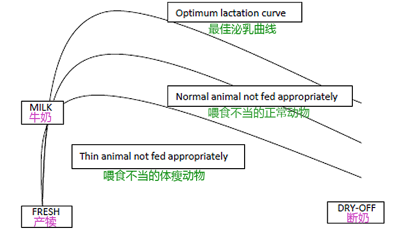 底下的曲線是產(chǎn)犢時(shí)體瘦的牛,她進(jìn)食不足無法保持體重,無法到達(dá)產(chǎn)奶高峰,從開始產(chǎn)奶曲線就下滑。這樣的奶牛不但不給農(nóng)場產(chǎn)出利潤,還可能耗費(fèi)牧場的經(jīng)營成本。但這不是她的問題;是我們對(duì)她管理不當(dāng)。