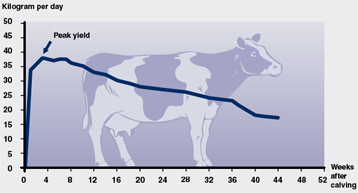 在下面的圖表里,上面的曲線是理想的泌乳曲線;奶牛產(chǎn)犢,奶量增加并達(dá)到產(chǎn)奶高峰,然后產(chǎn)奶量緩慢下降,直至停止擠奶。這是一個(gè)理想曲線, 只能在牛產(chǎn)犢時(shí)體況評(píng)分為3.5的條件下才能得到。