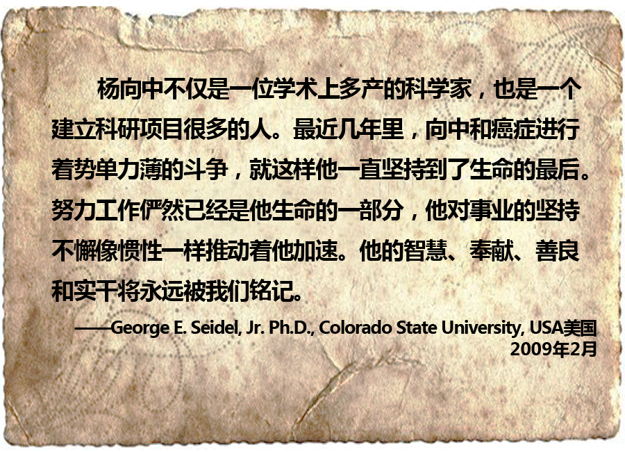楊向中博士的一生雖然短暫,但是沾溉后人的事跡很多,成就也很多,寫(xiě)不勝寫(xiě)。今天,我們僅以這篇小小的微信文章紀(jì)念向中公司的創(chuàng)立者逝世9周年,緬懷之余,也希望不僅有美國(guó)人還有更多的中國(guó)人記住他的名字——著名華裔科學(xué)家世界“克隆牛之父”楊向中!