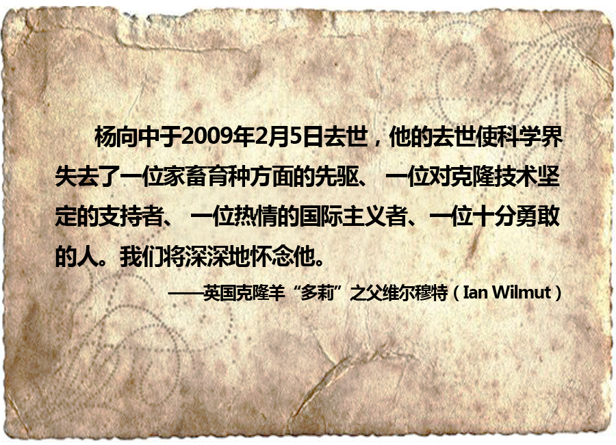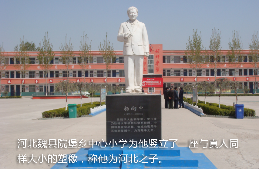 在與病魔進(jìn)行了長(zhǎng)達(dá)12年的斗爭(zhēng)后,楊向中于2009年2月5日在美國(guó)波士頓病逝,享年49歲。他因克隆大型動(dòng)物被《吉尼斯世界紀(jì)錄》收錄,他的科研人生壯麗輝煌,他的名字被載入《世界名人錄》。