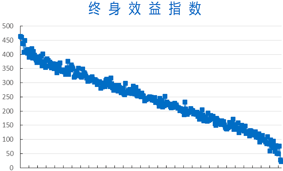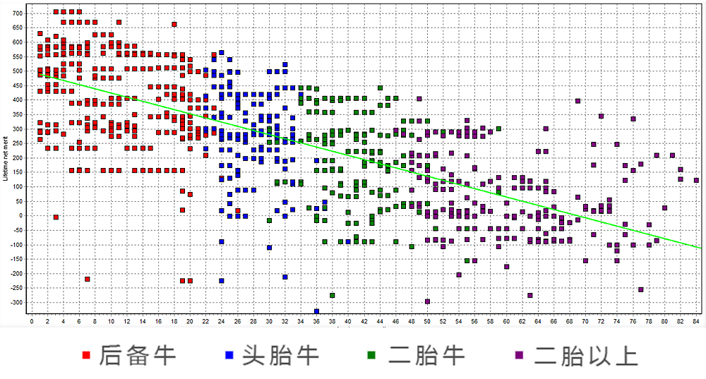 上圖中橫坐標(biāo)為月齡,縱坐標(biāo)為遺傳效益指數(shù),每個點(diǎn)代表一頭牛,不同顏色代表不同胎次牛。
