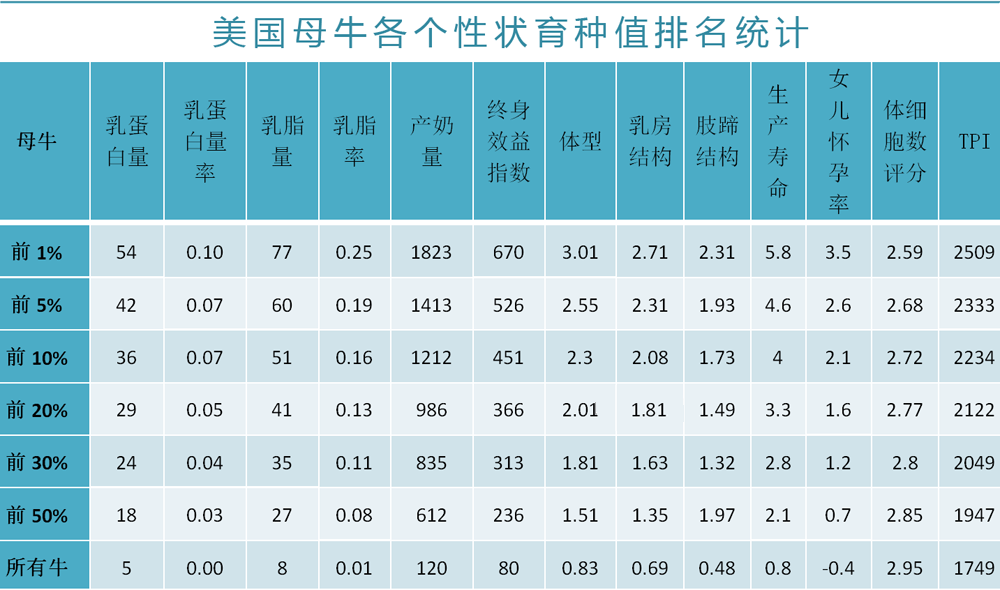 其次,你需要清楚地知道每一頭牛的生產(chǎn)性狀育種值(產(chǎn)奶量、乳蛋白量、乳脂量)、健康性狀育種值(生產(chǎn)壽命、女兒懷孕率、體細(xì)胞數(shù)評分)以及體型性狀育種值(體型、乳房結(jié)構(gòu)、肢蹄結(jié)構(gòu))。下表為美國荷斯坦協(xié)會在2018年4月公布的美國牛群各性狀的育種值。你了解到你的牛群存在的差距了嗎?