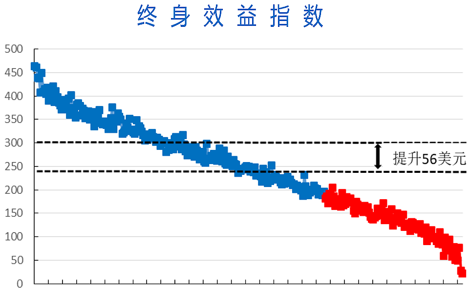 如下圖,將遺傳品質(zhì)最差的100頭犢牛出售以后,剩下的犢牛平均終身效益指數(shù)能夠提升56美元,達(dá)到300美元,每頭牛將來能夠?yàn)槟翀鲑嵉腻X更多。