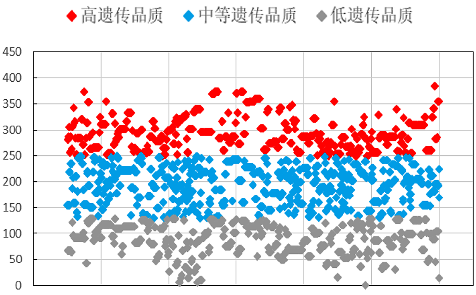 另一方面,在牧場規(guī)模較小的時候,飼養(yǎng)400頭犢牛和飼養(yǎng)300頭犢牛在管理上的挑戰(zhàn)較小,但是對于大型牧場來說,飼養(yǎng)3000頭犢牛和飼養(yǎng)2000頭犢牛有著本質(zhì)的區(qū)別,對牧場的管理要求更高。這種情況下牧場又該怎么制定育種規(guī)劃呢?同樣利用優(yōu)選軟件也可以知道牧場全群牛的遺傳品質(zhì)。下圖是牧場牛群遺傳品質(zhì)分布圖。牧場中永遠(yuǎn)都是高遺傳品質(zhì)和低遺傳品質(zhì)的牛各占一部分,大部分牛都屬于中等遺傳品質(zhì)。那么,牧場是否可以選擇牛群中的某一部分牛生產(chǎn)下一代呢?