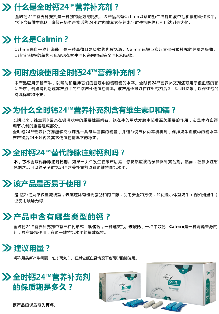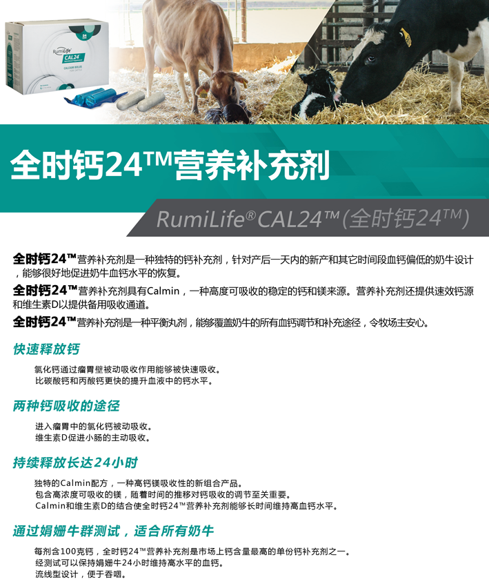 全時(shí)鈣24?營(yíng)養(yǎng)補(bǔ)充劑是一款與眾不同的鈣劑產(chǎn)品。每劑含100g鈣,是鈣含量非常高的產(chǎn)品。包含有快速釋放型鈣——氯化鈣,能夠迅速被瘤胃壁吸收。另一部分組分是Calmin,是一種易吸收的鈣鎂化合物,對(duì)于鈣的吸收調(diào)節(jié)有著重要的促進(jìn)作用。再加上能夠促進(jìn)小腸對(duì)鈣主動(dòng)轉(zhuǎn)運(yùn)的維生素D,使得全時(shí)鈣24?能夠在相當(dāng)長(zhǎng)的時(shí)間內(nèi)給奶牛不斷提供充足的血鈣。通過(guò)這些獨(dú)特的組分,全時(shí)鈣24?能夠給新產(chǎn)牛或其它缺鈣奶牛提供長(zhǎng)達(dá)24小時(shí)的充足血鈣補(bǔ)給。