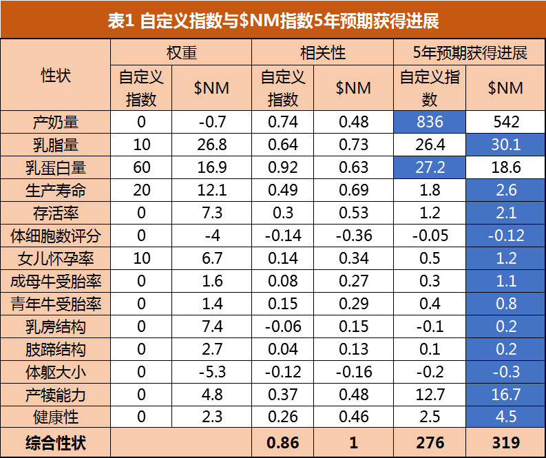 那么,自定義指數(shù)是實(shí)現(xiàn)更快遺傳進(jìn)展和群體盈利能力的最好方法嗎?許多牧場主相信——如果選擇的性狀集中在一個(gè)或者極少數(shù)性狀上,那么牛群遺傳進(jìn)展會(huì)更快。但是,許多性狀都會(huì)影響到牧場的實(shí)際盈利能力,自定義指數(shù)可能會(huì)忽視相關(guān)性狀對(duì)遺傳價(jià)值的影響,導(dǎo)致高估或低估一些特定性狀的價(jià)值。本文主要針對(duì)自定義指數(shù)存在的錯(cuò)誤觀點(diǎn)以及可能產(chǎn)生的后果進(jìn)行說明。制定自定義指數(shù)時(shí)很容易忽略遺傳性狀之間的相關(guān)性,隨著時(shí)間的推移,這可能對(duì)群體遺傳進(jìn)展產(chǎn)生重大影響。為了說明這一點(diǎn),在2018年8月出版的$NM修訂版中,用各個(gè)性狀之間的相關(guān)性和遺傳進(jìn)展公式創(chuàng)建了一個(gè)電子表格,當(dāng)改變某個(gè)性狀的權(quán)重時(shí),電子表格可以預(yù)測預(yù)期的性狀遺傳進(jìn)展。假設(shè)一個(gè)牧場主要關(guān)注牛奶中的蛋白質(zhì),自定義指數(shù)時(shí)就可以對(duì)蛋白質(zhì)設(shè)定一個(gè)相當(dāng)大的權(quán)重,只給乳脂量少許的權(quán)重;同時(shí),這個(gè)牧場還重視奶牛的健康性狀,那么就需要集中在女兒懷孕率和生產(chǎn)壽命上。因此,這個(gè)牧場的自定義指數(shù)權(quán)重為60%的蛋白質(zhì)、10%的脂肪、20%的生產(chǎn)壽命和10%的女兒懷孕率。這個(gè)指數(shù)非常簡單,緊緊地集中在幾個(gè)最重要的性狀上面。表1顯示了自定義指數(shù)($Cust)和$NM指數(shù)各個(gè)性狀的權(quán)重、相關(guān)性和預(yù)期遺傳進(jìn)展的比較,藍(lán)色部分為各個(gè)性狀在5年后獲得遺傳進(jìn)展的優(yōu)勢。