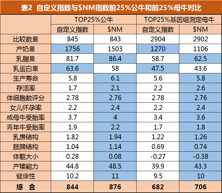 表1中,與$NM相比,自定義指數(shù)在乳蛋白量上將獲得更大的遺傳進(jìn)展,然而有趣的是,與$NM相比,女兒懷孕率和生產(chǎn)壽命的遺傳進(jìn)展預(yù)計(jì)會(huì)減少。請(qǐng)記住,自定義指數(shù)在這兩方面都有較高的權(quán)重,這是由于沒有考慮到女兒懷孕率和生產(chǎn)壽命與$NM其它性狀之間的關(guān)系。如果不選擇與女兒懷孕率和生產(chǎn)壽命相關(guān)的其它性狀,他們的預(yù)期遺傳進(jìn)展就會(huì)降低。為證明表1的預(yù)期結(jié)果,從2018年8月份開始,比較了目前在群的荷斯坦公牛,分別使用自定義指數(shù)($Cust)和$NM指數(shù)進(jìn)行排名,對(duì)比每項(xiàng)指數(shù)前25%的公牛各個(gè)性狀的育種值;同樣,將兩家大型奶牛場經(jīng)過基因組檢測的母牛集中在一起,也分別使用自定義指數(shù)($Cust)和$NM指數(shù)進(jìn)行排名,表2顯示出與表1相同的結(jié)果。(即使$Cust指數(shù)在PL和DPR上的權(quán)重更高,選出的公牛育種值仍然低于$NM)