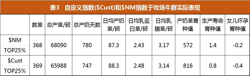 為了可以進(jìn)一步了解自定義指數(shù)和$NM指數(shù)在實(shí)際牧場中表現(xiàn),在2017年美國一家牧場對(duì)約1500只母牛進(jìn)行了回顧性分析。使用父母平均值用以計(jì)算每頭奶牛的自定義指數(shù)($Cust)和$NM指數(shù)。表3顯示了兩個(gè)指標(biāo)前25%的母牛各個(gè)性狀的實(shí)際表現(xiàn)和遺傳育種值。很有意思的是,自定義指數(shù)的群體平均產(chǎn)奶時(shí)間減少了33天。
