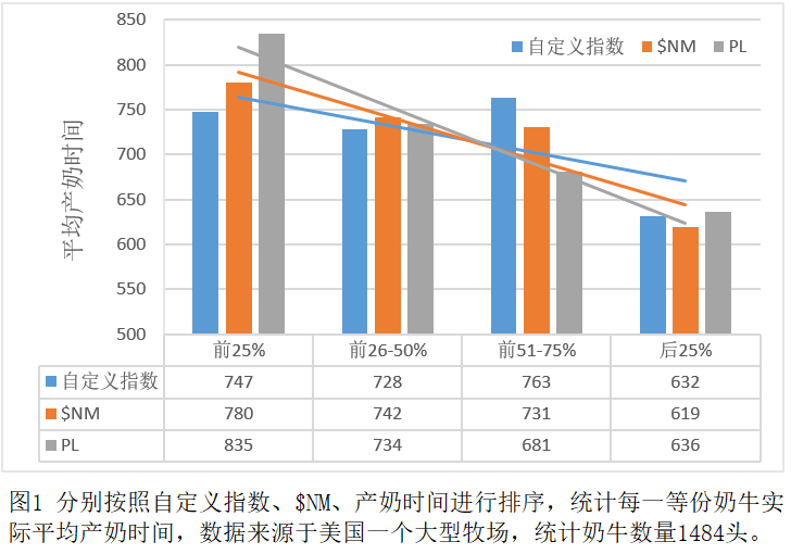 當(dāng)對(duì)群體中所有牛群按照四等分進(jìn)行比較時(shí),兩種選擇指數(shù)與奶牛的平均產(chǎn)奶時(shí)間產(chǎn)生了較大的差異,使用$NM指數(shù)與平均產(chǎn)奶時(shí)間的線性趨勢更加一致,這表明$NM指數(shù)對(duì)奶牛的產(chǎn)奶壽命指向性更好。(圖1)